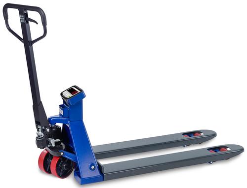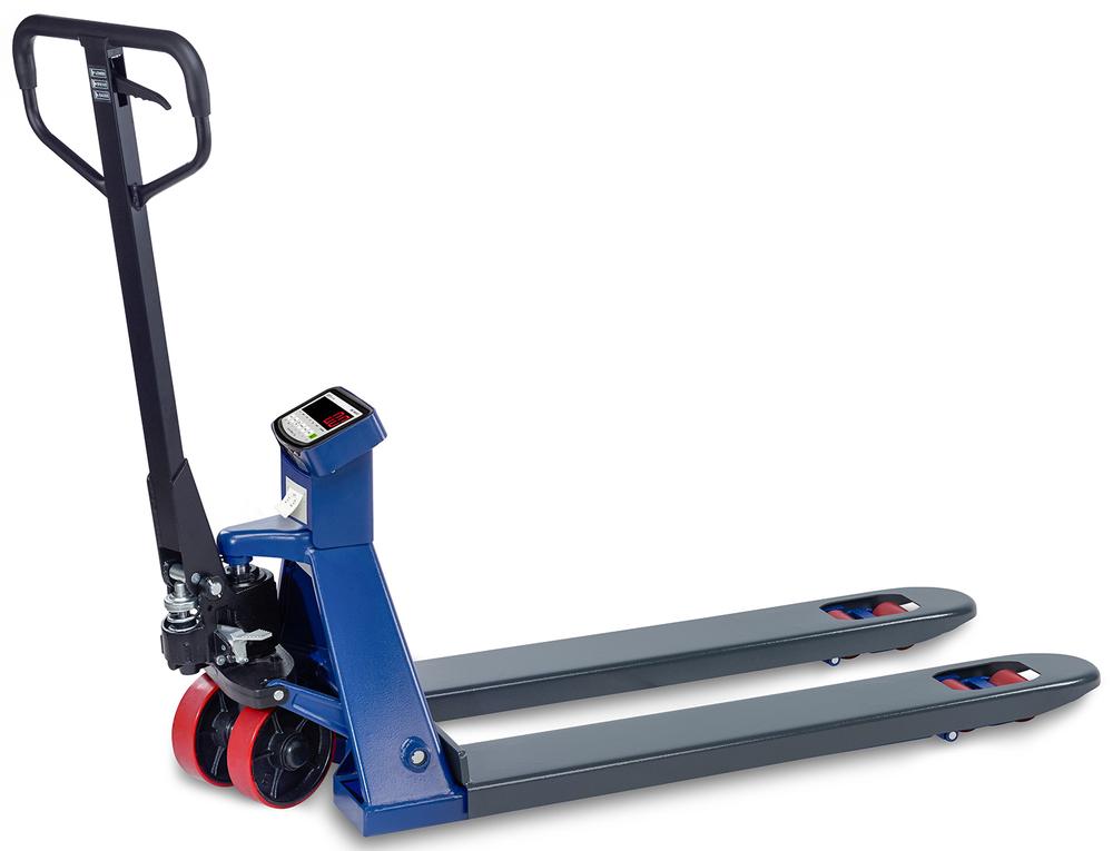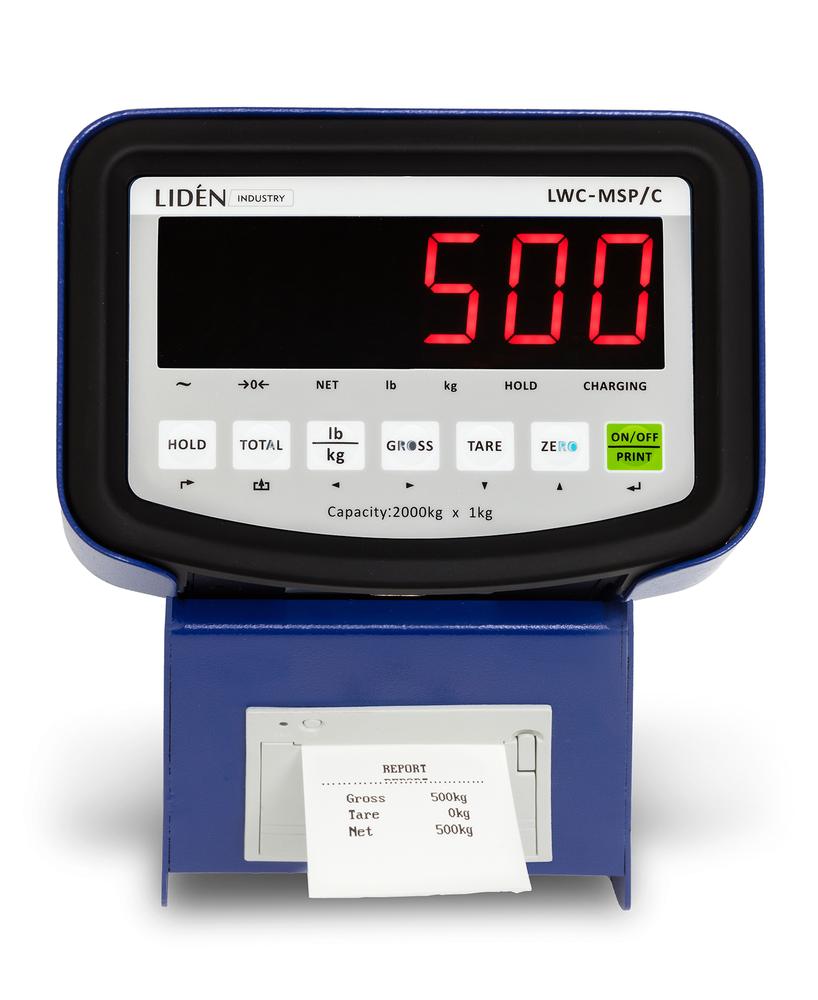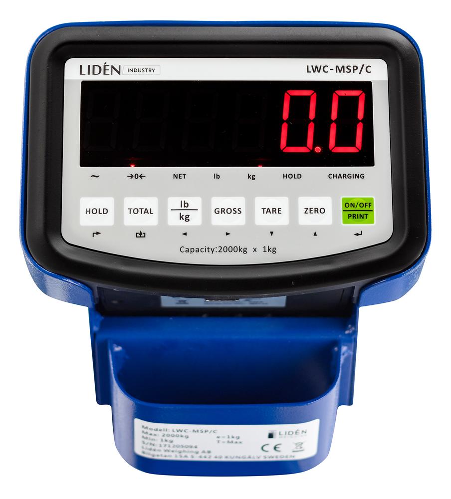 Industrial scale for mobile weighing with four load cells. Capacity 2000 kg x 1 kg. Silent PU-wrapped wheels. Rechargeable battery included. 30 mm red LED display. Battery time approx. 40 hours of continuous use.